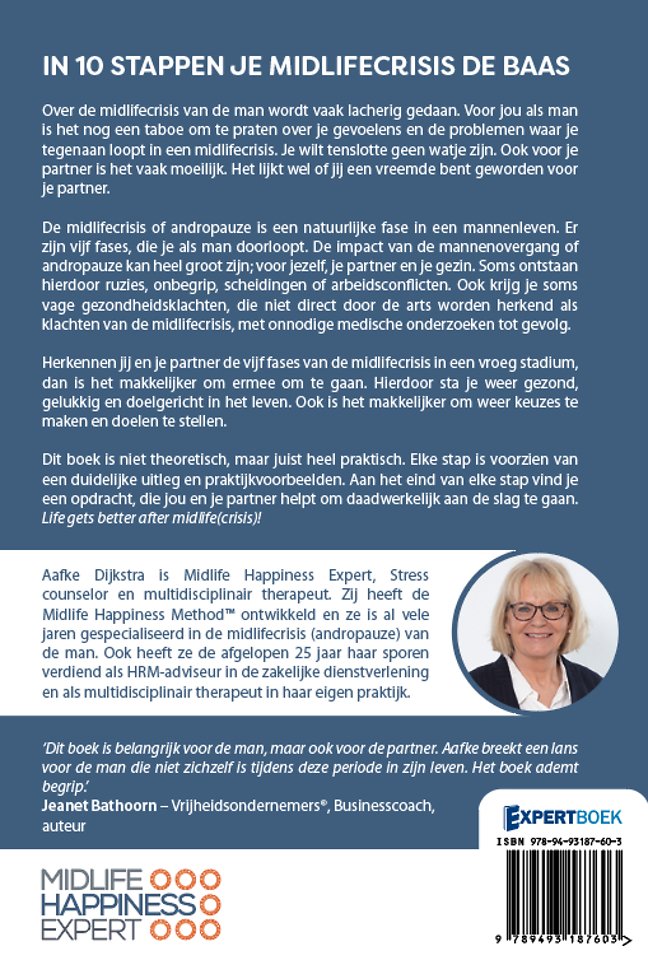"Dit boek is belangrijk voor de man, maar ook voor de partner. Aafke breekt een lans voor de man die niet zichzelf is tijdens deze periode in zijn leven. Het boek ademt begrip." - Jeanet Bathoorn, Vrijheidsondernemers®, Businesscoach, auteur