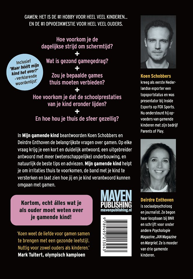 Koen en Deirdre geven korte en duidelijke antwoorden, bieden de wetenschappelijke onderbouwing voor wie meer wil weten, geven haalbare spelregels voor hoe je het zelf in de praktijk kan brengen én geven veel eyeopeners. Kortom, alles wat je moet weten over hoe je een goede ouder kan zijn voor je gamende kind.