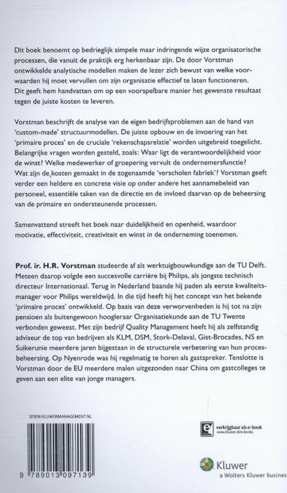 Vorstman beschrijft de analyse van bedrijfsproblemen aan de hand van 'custom-made' structuurmodellen. De juiste opbouw en de invoering van het 'primaire proces' en de cruciale 'rekenschapsrelatie' worden uitgebreid toegelicht.