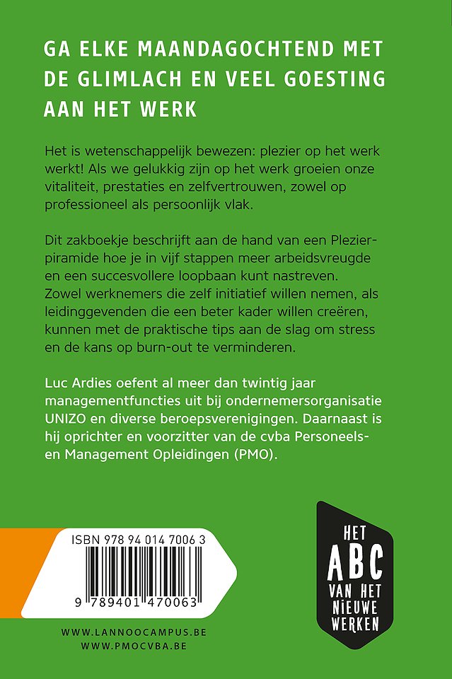 Dit zakboekje beschrijft aan de hand van een 'Plezierpiramide' hoe je in vijf stappen meer arbeidsvreugde en een succesvollere loopbaan kunt nastreven. Zo kun je elke maandagmorgen met de glimlach en veel goesting alweer een leuke werkweek aanvatten.