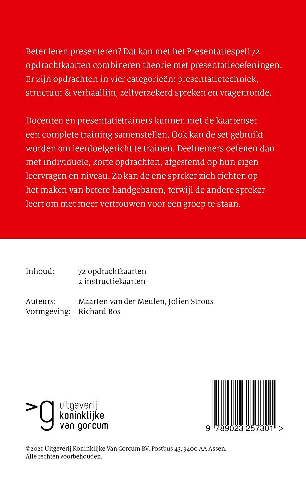 Beter leren presenteren? Dat kan met het Presentatiespel! 72 opdrachtkaarten combineren theorie met presentatieoefeningen. Er zijn opdrachten in vier categorieën: presentatietechniek, structuur & verhaallijn, zelfverzekerd spreken en vragenronde.